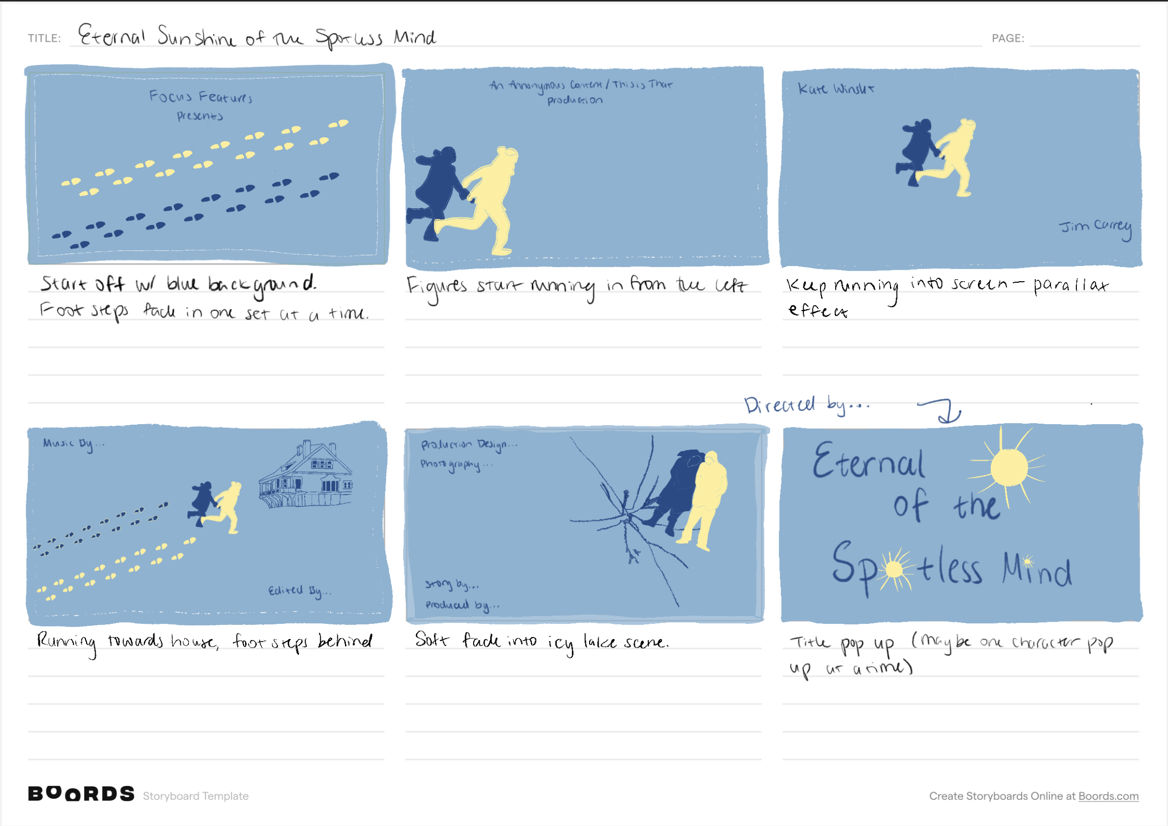 A reimagined title sequence for Eternal Sunshine of the Spotless Mind, created using hand-traced stills from the film and stop-motion animation. Color becomes a visual identity for each character, while the silhouetted figures evoke blankness—a reset, mirroring the film’s themes of memory erasure and starting anew.